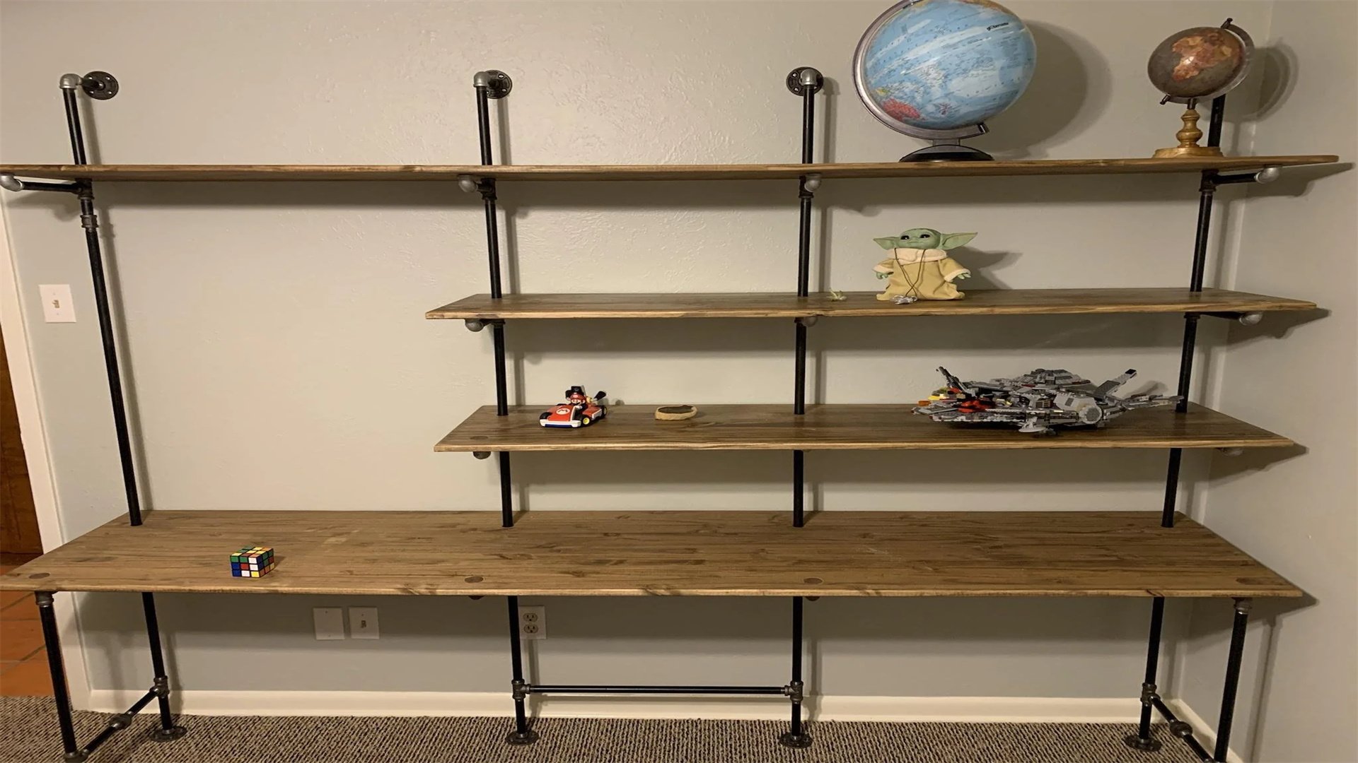 - Install Shelves: Place wood planks on the pipe supports. For added security, screw planks to flanges or use pipe clamps. Check levelness and adjust pipe heights as needed. Test weight capacity with items, and consider adding diagonal braces for taller units to prevent swaying.