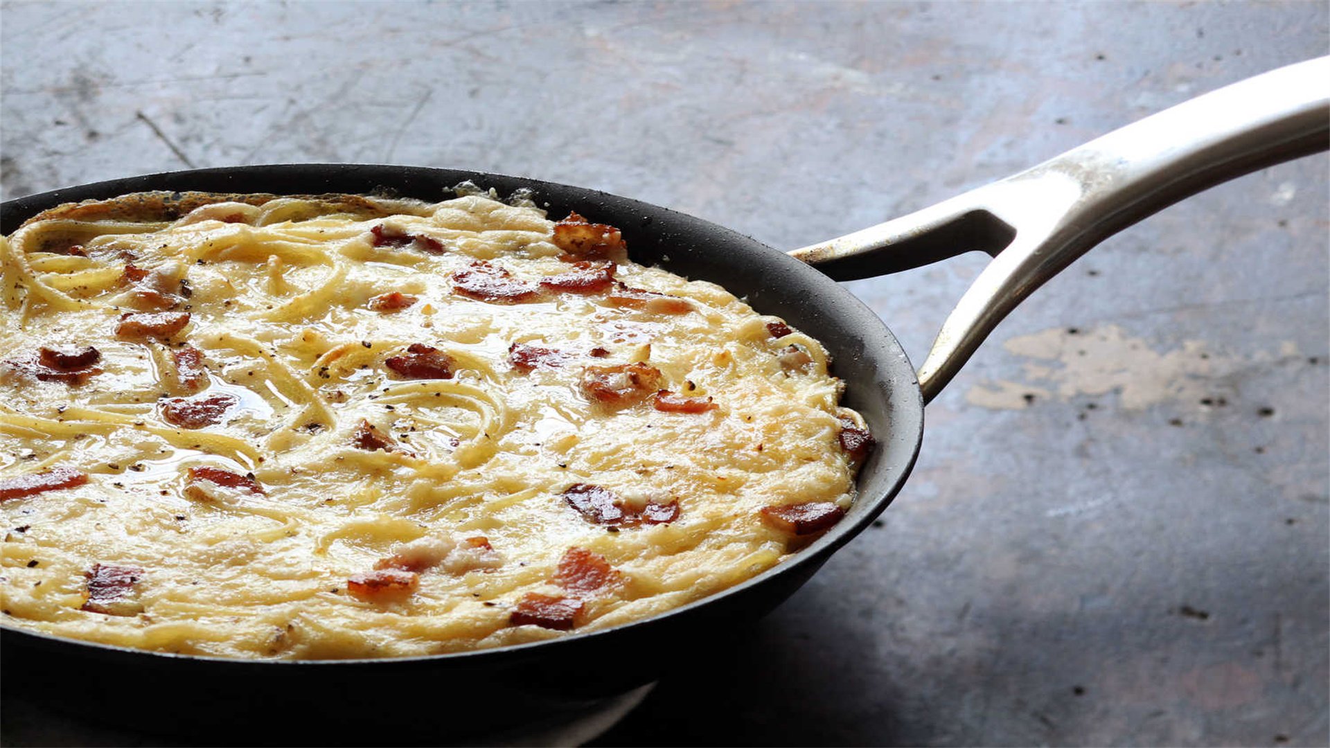 - Heat oil in an oven-safe skillet, add pasta, and pour egg mixture over.