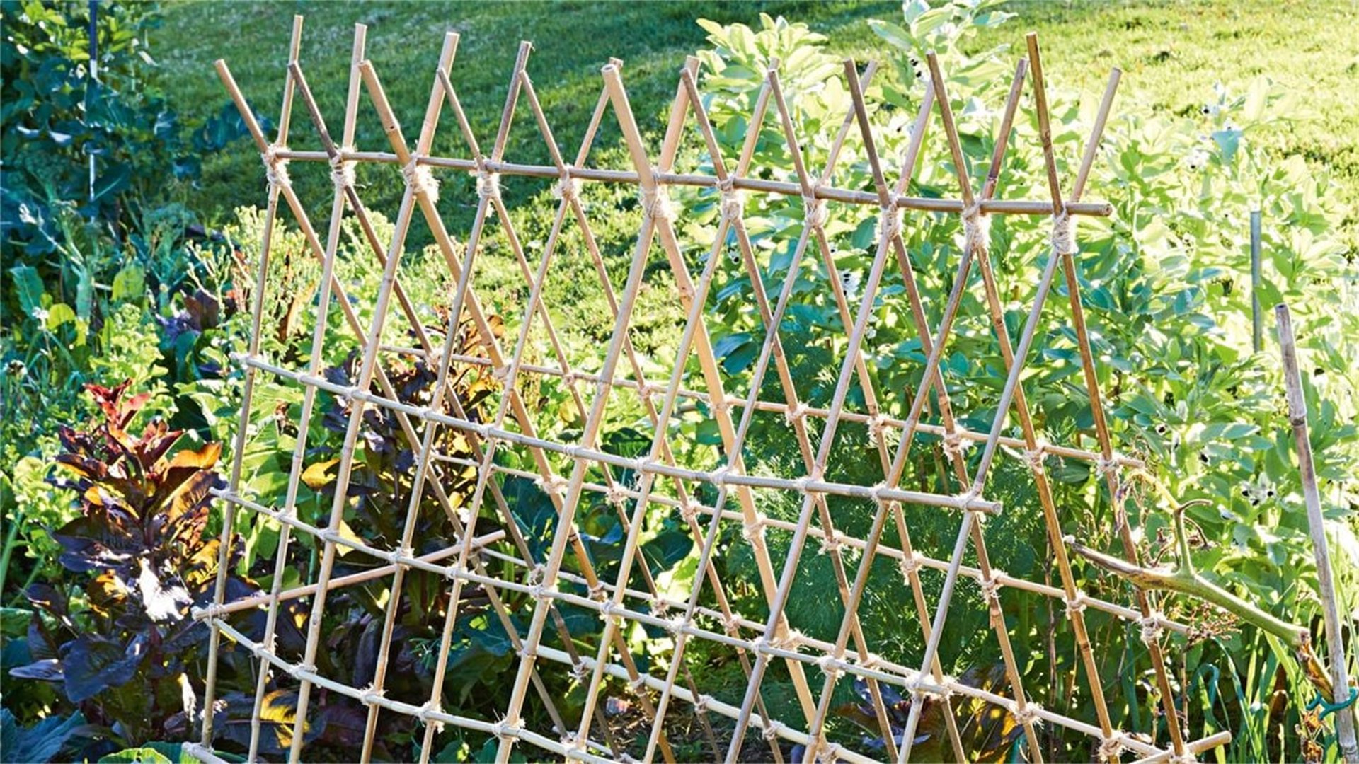 - Finish and install: Check the structure for stability by gently shaking it. To install, position the A-frame over a garden bed where plants are already growing or will be planted. Push the bottom ends of the side poles into the soil, about 6 inches deep, using a mallet if needed. For extra security, drive wood stakes into the ground next to the poles and tie them together. Train young plants onto the trellis by loosely tying stems to the crossbars with twine.