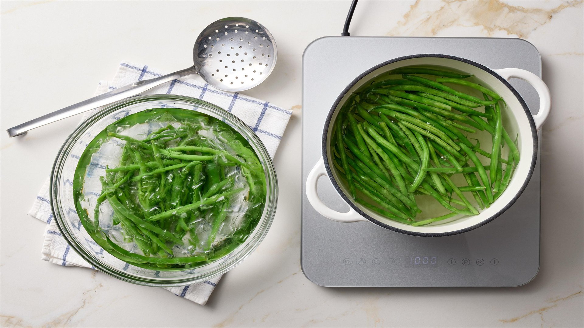 - Blanch green beans for 2-3 minutes until bright green and firm.