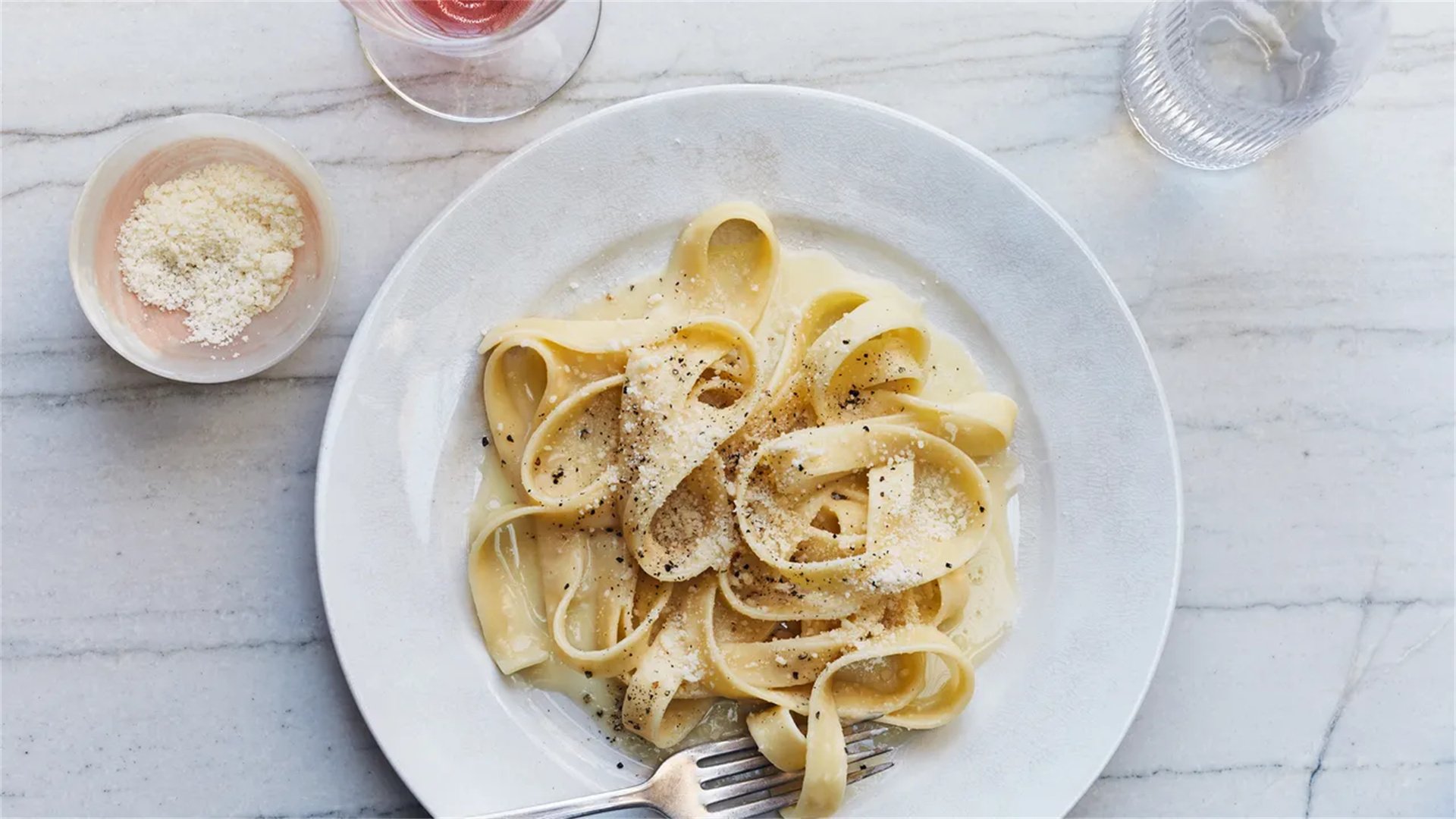 - Divide the pasta among warm plates. Grate Parmesan cheese on top.