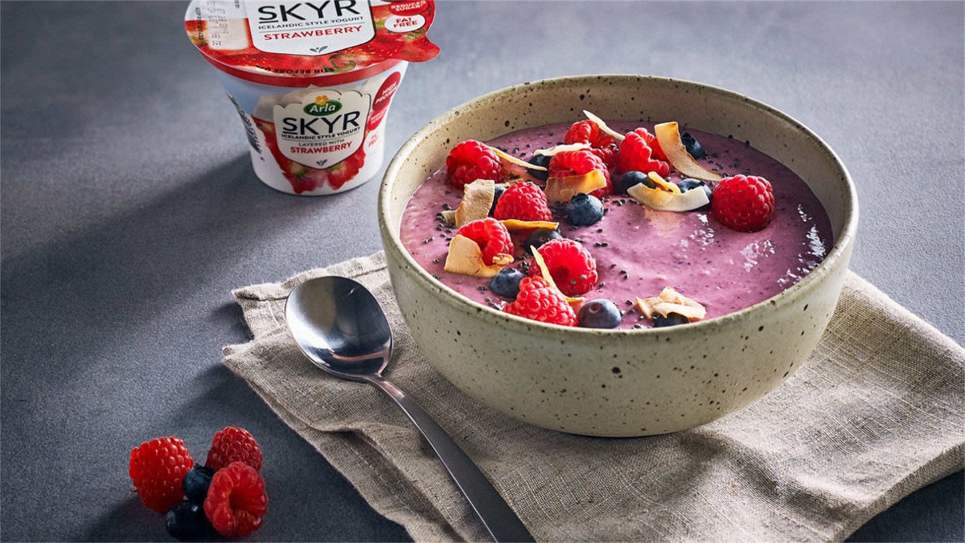 - Description: A blended smoothie bowl topped with fresh ingredients.