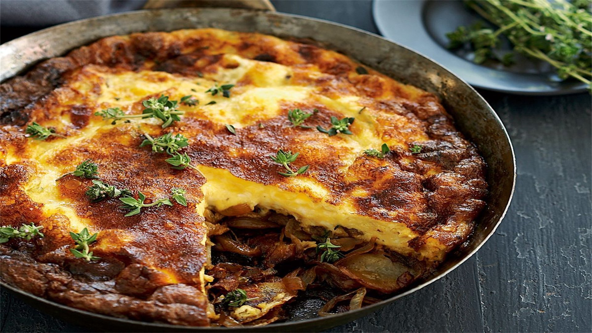 - Description: Baked egg dish with caramelized onions and cheese.