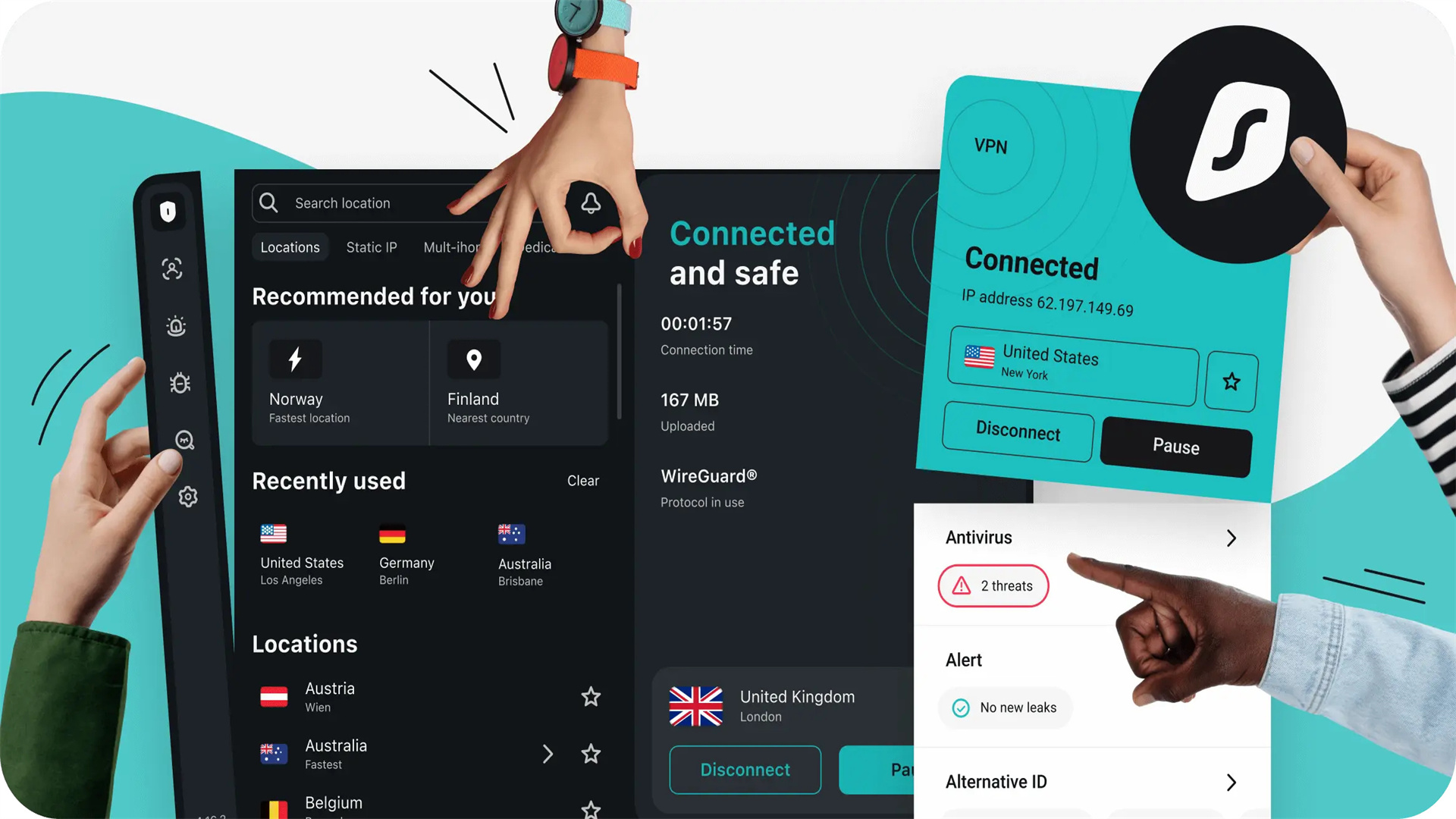 Surfshark offers premium security at an affordable price, making it a popular choice for individuals and families. It allows unlimited device connections, so you can secure every phone, tablet, and computer under a single subscription.