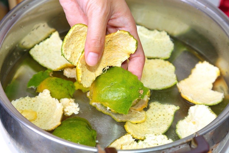 Orange peels have natural cleaning properties and can remove dirt and odors. Put the orange peels in a pot, add an appropriate amount of water, bring to a boil, then reduce to a simmer and cook for about 10 minutes.